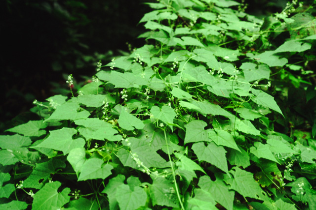 アレチウリは大型のツル植物で1年生草本。北米原産の帰化植物で、耕作放棄地など肥沃な場所で急速に成長して繁茂する。葉や茎は著しくざらつき、長い葉柄があり互生する。葉腋に雌雄別の花序を出し、直径1cmほどの黄白色の花をつける。果実には鋭いとげがある。密生して生育している。駆除すべき特定外来生物の一つに指定されている。