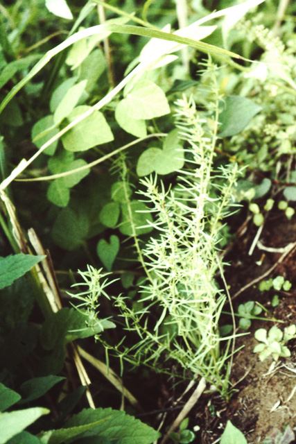 日当りのよい草地に生える多年草。全体が淡緑色で高さ35cm位になる。葉は線形で先が尖っている。初夏の頃、葉えきから出る短い柄に外側が緑で、内側が白い花が咲く。果実は球形で中に種子が1個ある。半寄生植物で根の先で他の植物から養分を奪い取っている。