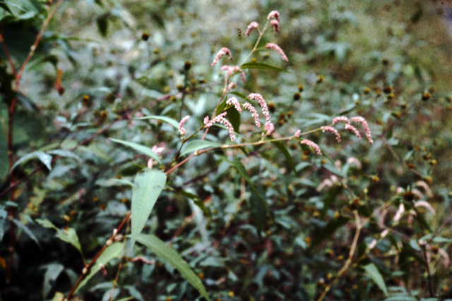水辺に生える一年草。茎は高さ1.2mになり、節は太くふくらみよく枝分かれする。葉は披針形で15cm前後、平行する側脈がある。花は穂状に密集してつき、5〜7cmで先は垂れ下がる。淡紅色から白色に近いものまである。果実は黒褐色で光沢がある。
