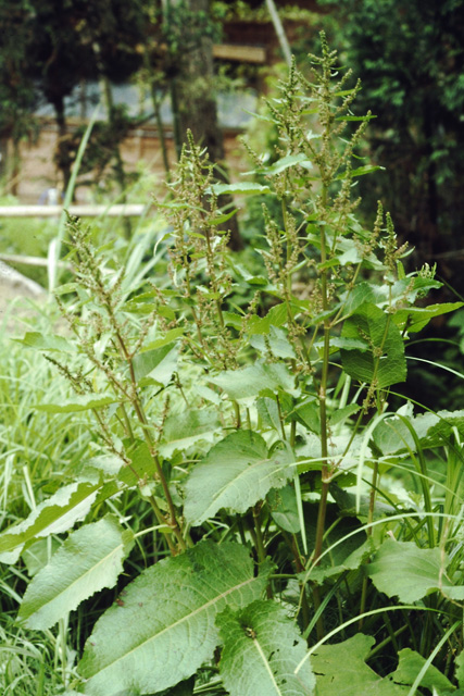 ヨーロッパ原産の帰化植物。小国には近年に入り、現在は道ばたに普通に生える多年草。茎は1.2m位になる。葉は長さ22cmの大きさになる。7〜10月、茎の先が枝分かれして小さい花を多数つける。果実のまわりの花被片の縁に1.5mm位の刺がある。