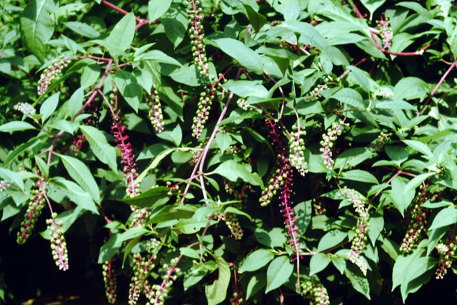 北アメリカ原産の帰化植物。空き地や道ばたに生える多年草。茎は紅色を帯び、高さ1.5mに達する。花は白色で6〜9月、花軸に多数つき、果実になると垂れ下がる。果実は平たい球形で分果にならない。つぶすと紅紫色の汁がつく。秋に全体が赤くなる。有毒植物。