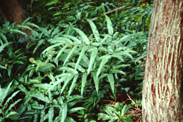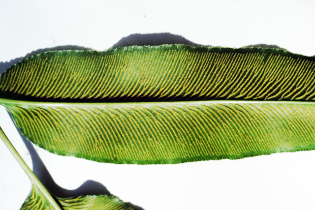 山地林内に生える常緑性シダ。谷筋斜面に群生する。葉は長さ80cm前後、1回羽状に分裂。同属のイワガネソウに似るが、羽片の先端は急に締まり尾状。葉脈は編目をつくらず、葉縁のきょ歯の中まで達する。胞子のう群は脈上につき、葉縁から5mmほど手前の線にそろう。