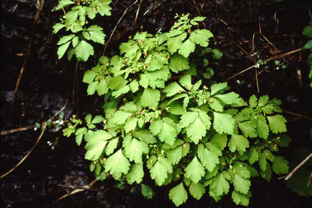 山地の谷間や渓流のほとりに生える多年草。地下茎は短く広い鱗片に包まれている。茎は高さ25cm位になり、根生葉と茎葉は3小葉からなり、ふぞろいの切れ込みがある。花は黄緑色で外側は紫色、花びらの1枚は内側に垂れる。全体が軟らかく、やさしい姿をしている。