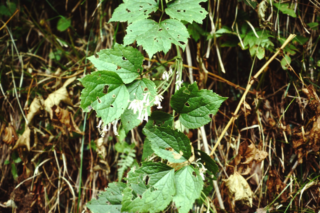 山に生える多年草。茎は高さ1m位になり、下部は木質。葉は3出複葉で小葉には浅い切れ込みと大きなきょ歯がある。花は葉えきと茎の先にたくさん集まって下向きに咲く。がく片は4個、筒状で先はそりかえり、外側は毛が密生して白色。内側は淡紫色。雌雄異株。