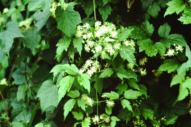 山の林の縁などに生える多年草。茎は細いつる性。葉は長い柄があって3出複葉で小葉の縁は欠刻。花は8〜9月、葉えきから出た枝に集まってつく。花びらはなく、花びら状のがく片が4枚平らに開く。花後に果実ができると雄しべが伸び、羽状になる。