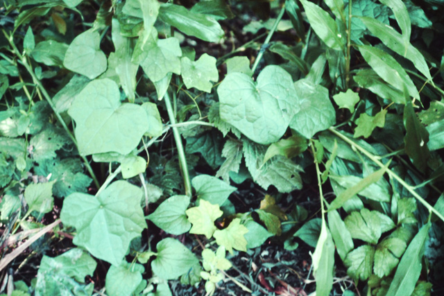 山の林の中や道ばたに生える多年性雌雄異株のつる植物。葉は長い柄をもち、五角形ないし七角形で径7〜10p、葉の形がコウモリの羽に似ていることからこの名がついた。5〜6月、葉の脇から伸びた柄に、小さい淡緑色の花をつける。果実は黒く熟す。