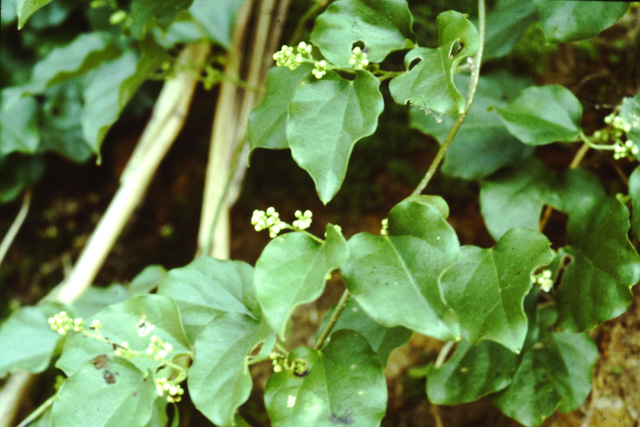 山の道ばたに生えるつる植物。茎は細く、他の木などに巻きついて長く伸びる。葉は広い卵形や浅く3つに分かれるものがある。葉のわきに淡黄色の小さな花をたくさんつけ、秋に熱す果実は青黒色で白い粉をつけている。昔、このつるでつずらをつくった。別名カミエビ