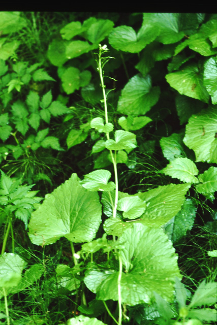 山の谷間や水気の多い草地に生える多年草。香辛料に用いられるワサビに似ているが地下茎は細い。葉はハート形で縁にぎざぎざがある。茎には小さい葉がつき、春、先の方に白い花をつける。花をつけた茎は倒れて直立しない。小国には少ない。