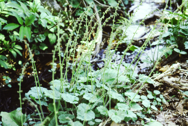 湿気のある山の林の中に生える多年草。春に長い葉柄のある葉がまとまって出る。葉は広い卵形で、浅く五つに裂け、縁に不揃いの大きいきょ歯がある。早春、花茎に細かく枝分かれした花をつける。裂けて開いた果実が中国の楽器、チャルメラに似ている。