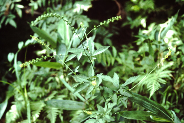 人家に近い山の林や道ばたの草むらに生える多年草。茎は毛があり、高さ150cm位になる。夏から秋に茎の先が枝分かれして黄色い花が細長く集まって咲く。花が終わると、かぎ状の毛で衣服につき、種子が運ばれる。全体が小形のヒメキンミズヒキもみられる。