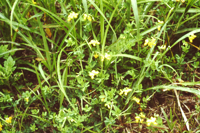 日当りのよい道ばたに生える多年草。茎は地をはい、長さ30cm位になる。葉は3小葉で葉柄の元に小葉と同じ形の2枚の托葉がある。4〜10月、長い柄の先に1〜3個の鮮黄色の花をつける。実は細長く、2〜3.5cmで熱すとねじれて種子を飛ばす。