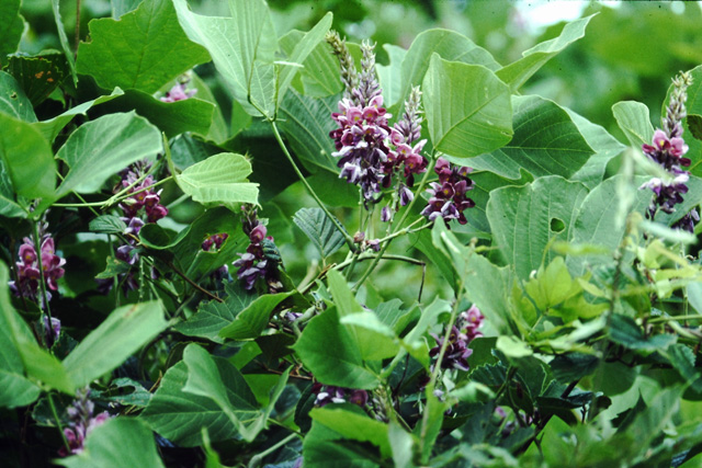 山の道ばたや川の土手、林の縁に生える多年草。茎は長く伸びる。葉は直径15cm位の角ばった円形の3小葉で、多くは2〜3裂する。夏から秋、葉えきに20cm位の花序に紅紫色の多数の花をつける。根から取ったデソプンを葛粉(くずこ)という。