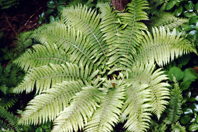 山地林内に生える夏緑性シダ。根茎は太くて直立し、葉を多数そう生する。春の芽立ちは力強く、やがて葉がそろって展開し、きれいなロートができる。伸びきると車状に広がり壮大。長さ1.5mに達し、「雄シダ」という名にふさわしい。胞子のう群は葉身の上半分に着く。
