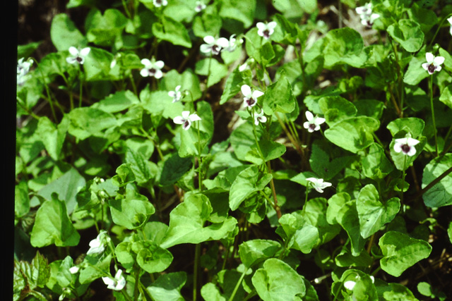 田の畔や道ばた、畑や人家の周辺に普通にあり、水湿のある所を好んで生える多年草。茎はややはって立ち上がり、長さ30cm位になる。葉は幅2〜3.5cmのハート形、4〜5月、白色で紫色のすじがある小さな花を開く。別名ニョイスミレという。