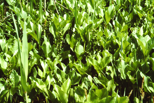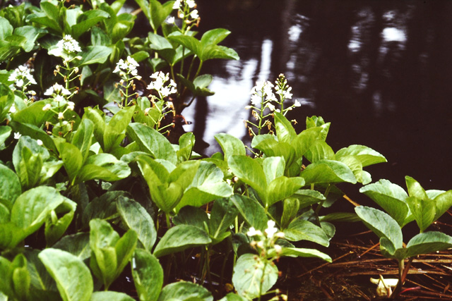水辺に生える多年草。一般に高地の沼や湿地に生えるが。小国にもまれにある。水底に太い地下茎があり、水面上に長い葉柄が出る。葉の形がカシワの葉に似ているところから名がつけられた。春、花茎に白い花が総状につく。花冠は5裂し、裂片の内側に自毛がある。