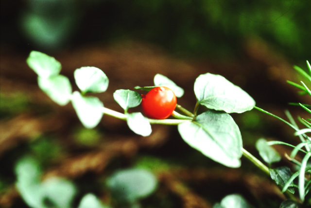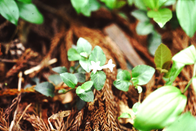 山の林の木陰に生える多年草。茎はつる性で地上をはい、節から限を出し長さ40cm位になる。葉は光沢のある濃い緑色の広卵形で厚く、対生する。花は6月頃、茎の先に2個ずつつき、花冠は白色で先は4裂して開く。実は2個が合着して球形になり赤く熱す。