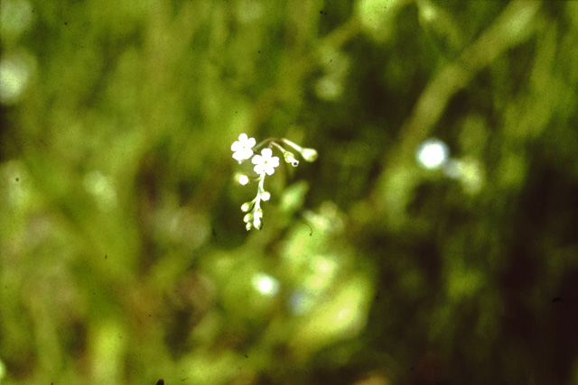 畑や道ばたに生える越年草。茎は下部で分枝、直立し高さ30cm位になる。茎の下部に柄のある葉がつき、上部には穂状に花がつき、先端はぜんまい状に巻いている。花は春に咲き、花冠の直径は2mm位、茎葉をもむとキウリの匂いがするのでキウリグサという。