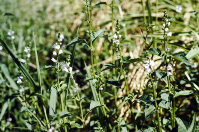 山の道ばたに生える一年草。茎は四角形でかどにまばらに下向きの毛があり、節には白毛がある。高さ60cm位になる。葉は柄があり縁に荒いきょ歯がある。花は秋、茎の上部に集まって花穂をつくる。がくの基部に白毛があり、花冠は白色でわずかに淡紅色をおびる。
