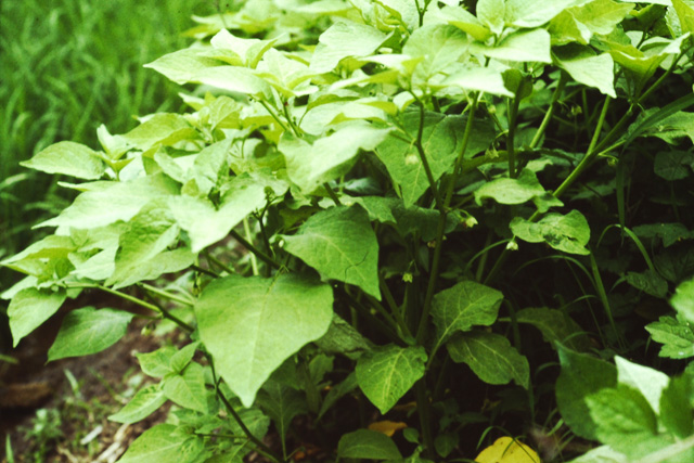 山の木陰に生える多年草。茎は二またに枝分かれして高さ70cm位になる。葉は長さ12cm位になる広だ円形。花は6〜9月、葉えきに2〜3個ずつつき、柄があってぶらさがる。がくは刺状の突起がある。白い実を”すっぱつめ”といい、子どもが食べる。