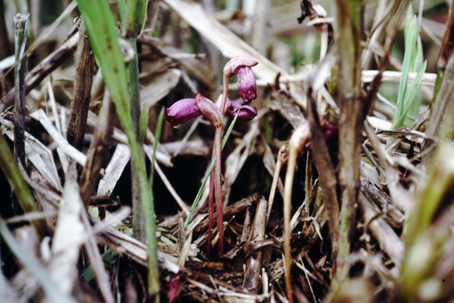 寄生植物でススキ、ミョウガ、スゲ類などの根に寄生する。秋に15cm位の長い花柄を数本のばし、その先に横を向いた大きな花を1個つける。花冠は淡紅紫色でやや厚みがある。長い花柄の姿がパイプを思わせるので「南蛮煙管(なんばんぎせる)」という名がついた。
