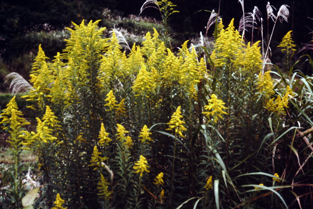 北アメリカ原産の帰化植物。近年、各地で土手や荒れ地に大群生し嫌われているが、小国ではごく最近目につくようになった。茎は高さ2m位になり、晩秋、円すい状に多数の黄色の花をつける。地下茎から他の植物の生育を妨げる物質を出して繁殖する。