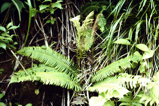 山地の明るい林内や斜面にごく普通な常緑性シダ。やや乾燥した所を好む。栄養葉はサカナの骨のように分裂して、十数枚ほど放射状に広がる。胞子葉はその中心から真直くに伸びだし、初め紅紫色、やがて緑色から茶褐色へと変わって胞子が熱す。