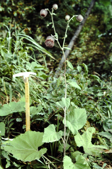 山に生える多年草。茎は紫色を帯び、直立し高さ1.5m位になる。葉は卵状長だ円形で基部はハート形になり、裏面は白い綿毛が密生する。秋に大きな頚花がうつむいてつく。笹だんごをつくるのに若い葉をゆでて混ぜ合わせ、つなぎと風味をつけるのに用いる。