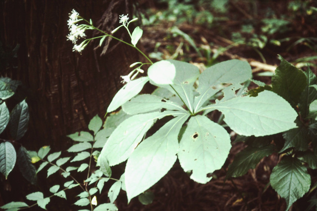 山の木陰に生える多年草。茎は硬く、直立して高さ80cm位になる。葉は倒卵形で茎の中ほどに7〜8枚輪生様につく。花は8〜9月、まばらに10個内外つく。葉を中肋から半分切り取り、風に向かうとよく回る。子どもは「風車」といって遊んだ。