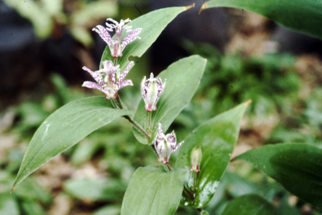 山の木陰の湿気のある斜面に生える多年草。茎は先の方が垂れ下がり、高さ1m位になる。葉は基部で茎を抱き、長だ円状披針形。花は秋、葉えきに2〜3個つき、上を向いて咲く。花被の内面にある紫紅色の斑紋を、ホトトギスの胸の模様に見立てて名付けられた。小国ではまれ。