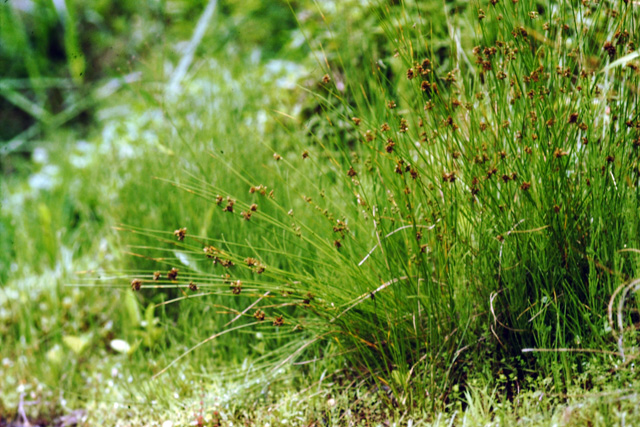 湿地や田の道ばたに固まって生える多年草。茎は丸く、高さ50cm位になり、葉は茎の基部に鱗片(りんぺん)状の鞘(さや)に退化している。花序は茎の途中から出ているように見えるが、それより先は包葉が伸びたもの。昔、髄(ずい)から燈芯(とうしん)をつくった。茎の細長い栽培種から畳表をつくる。