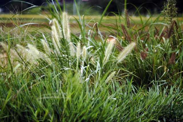 日当りのよい原野や路傍に生える多年草。密にそう生して大株となる。花は秋、60cm位の花茎を出して円柱形の穂を直立、紫の剛毛を水平に広げてよく目立つ。「力芝」とは力強い人でも容易に引き抜けないから。小国にほ総包が淡緑色のアオナカラシバ(写真手前)もまれに産する。