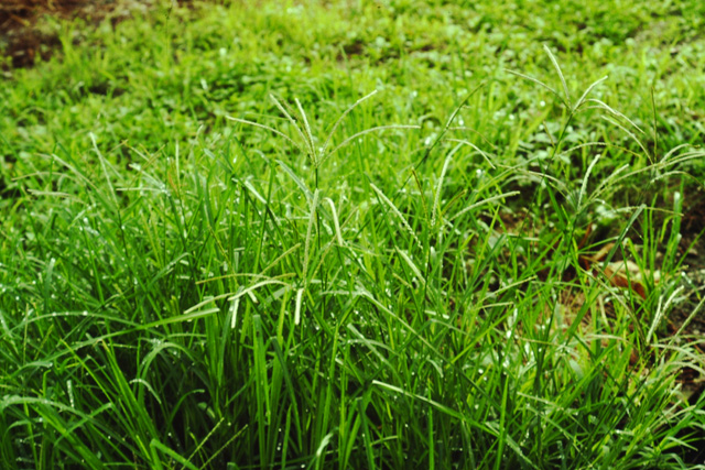 いたる所の道ばたに生える一年草。そう生して大きな株となり、高さ40cm位、強じんである。花は秋、茎の頂に緑色の穂を教本つけ、小穂はその片側に2列に並ぶ。「雄日芝」はメヒシバより大きく、夏の日照りでも繁茂するから。小国では近年入り込んだようでややまれ。