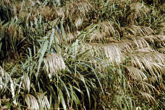 川原や沢などの湿地に群生する多年草。茎は高さ2m以上になり、基部の鞘には毛がある。ススキに似ているが小穂に芒(のぎ)がなく、基部の毛が白くて光沢があり、穂全体が銀白色に輝く。小国では茎が堅く丈夫なので簾(すだれ)や豆のくねに用いる。