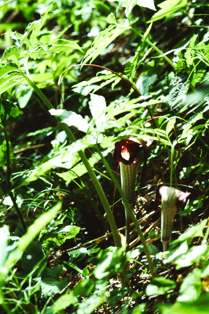 山地林内や木陰の草地に普通な多年草。雌雄異株で花は春、大きくなると雌になる。奇妙な形の苞に包まれ、葉の下の低い所につく。花の軸の上が1mにも伸び、糸を垂らすようなので「浦島草」という。球根は偏球形、上から根を出し、子いもをつくって盛んにふえる。
