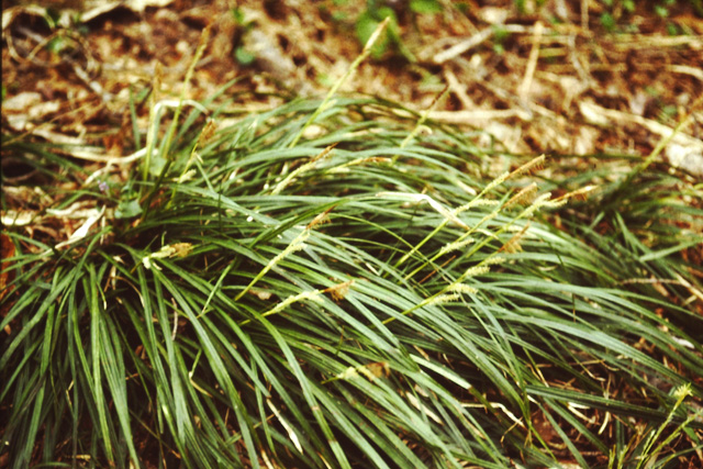 山地林内に普通な常緑多年草。主に日本海側に分布する。高さ30cm位で葉の幅は4mmほど。春、小穂は密に花をつけ、暗緑色の葉に黄色い雄花がよく目立つ。小国では近縁で形のよく似たオクノカソスゲも産するが、葉の幅が少し広いので区別できる。