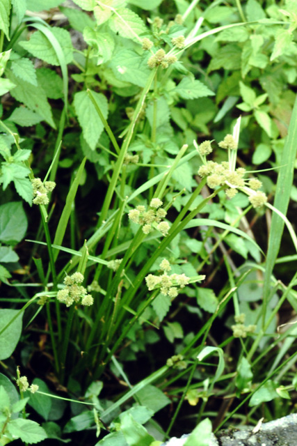 水田や浅い沼、湿地に生える一年草。乾いた所を嫌う。質軟らかく高さ30cm位、下にひげ根を出してそう生。秋、葉の間から茎を伸ばし、その先に2、3枚長い包葉をつける。小穂は紫褐色、包葉の中心から出た柄に球形に集まって開花。小国ではややまれ。